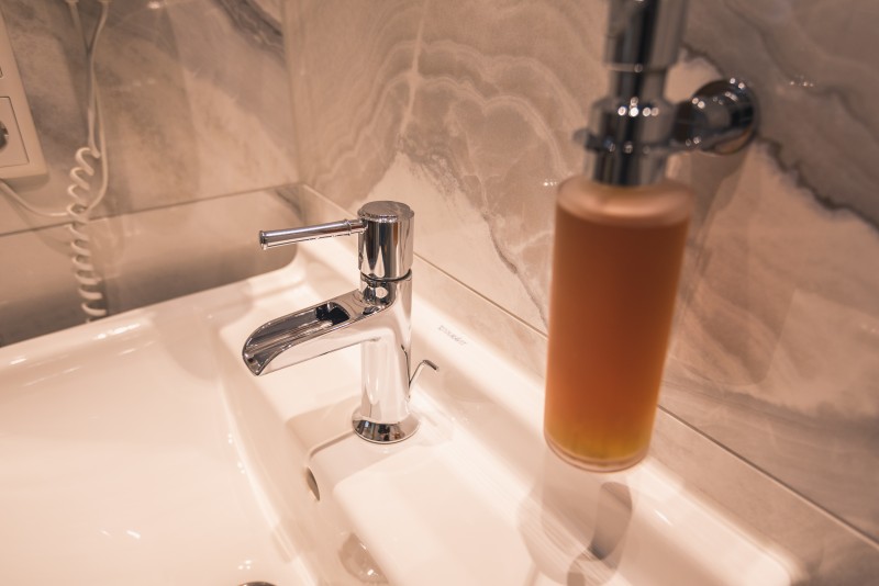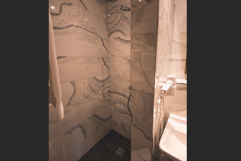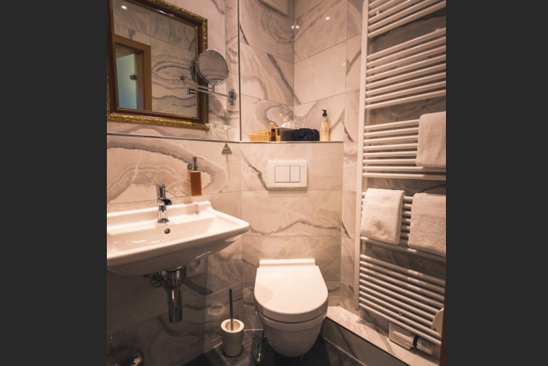 Das Bad zur alleinigen Nutzung ist mit WC, Waschbecken und Dusche.